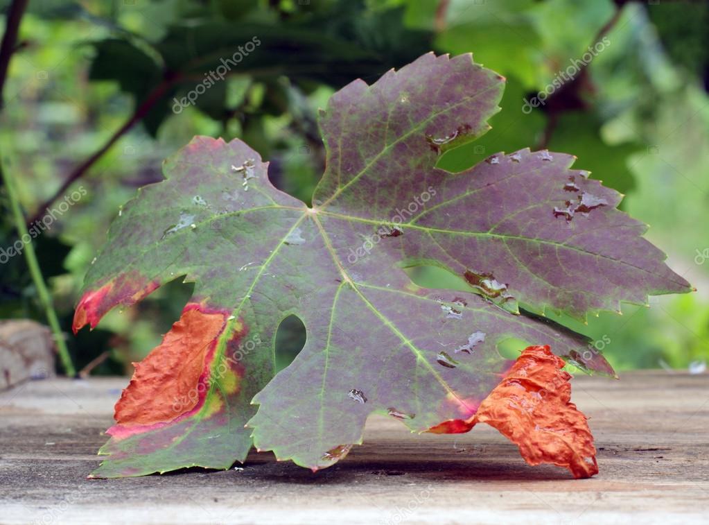 Kod belih sorati, pege su žute a crvene do crvenobraonkaste kod crnih sorata. Srednji deo pega nekrorira i postaje tamnocrven, zbog čega pege, odnosno oboleli delovi liske, izgledaju kao vatrom sprženi. Na listovima pri završetku porasta, ili na onima koji su prestali da rastu, javlja se veći broj sitnih pega. Intenzivne zaraze su na donjih šest, a ređe i na prvih 12 listova. Oboleli listovi prevremeno (krajem proleća)